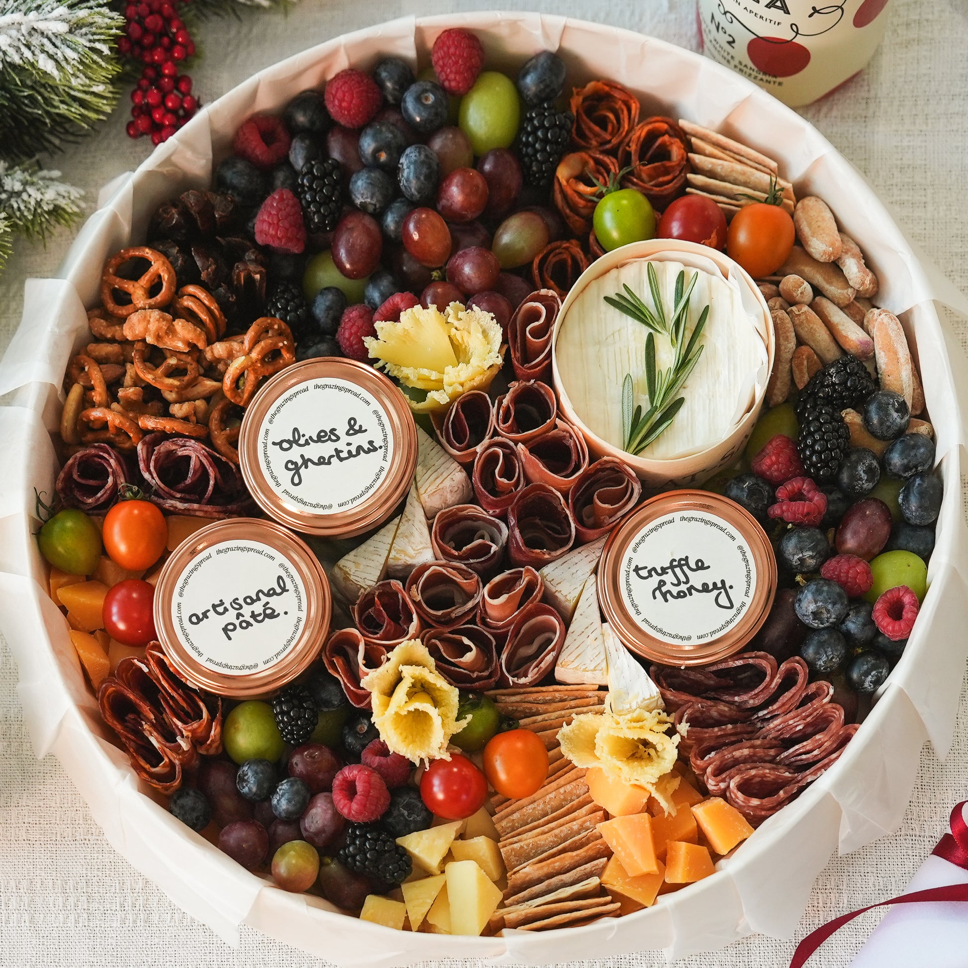 The spread comes with an assortment of premium cheese and cured meat, our house-made chicken pâté, Spanish olives, French gherkins, Medjool dates, mixed nuts, seasonal fresh fruits, sourdough crackers, and our customer favourite house-made truffle honey — artfully arranged in a biodegradable box for stunning presentation. Every spread includes serving utensils for effortless enjoyment.